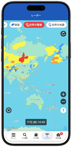 新バージョンのアプリは、世界の警報や地震情報を日本語(自動翻訳)で確認可能なほか、日本と変わらない「1kmメッシュ・5分ごと」という超高解像度の天気予報を利用可能。現地の気象局発表の情報よりも詳細な気象情報が、いつものアプリで確認できるという。