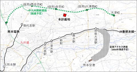 周辺県道の新設・拡幅とともに整備中の中九州横断道路(仮称)合志ICより約2kmに位置し、阿蘇くまもと空港と豊肥本線を結ぶ空港アクセス鉄道(2034年開通予定)も計画されるなど、広域交通アクセスも優れているという。