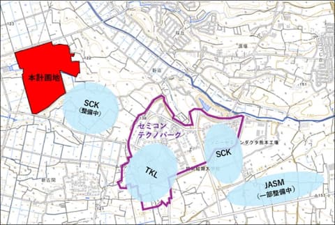 プロジェクト予定地は、熊本県合志市竹迫。台湾TSMC子会社のJapan Advanced Semiconductor Manufacturing(JASM)、東京エレクトロン九州、ソニーセミコンダクタマニュファクチャリングなど、半導体関連企業が立地する、国内有数の産業集積エリアに近接し、敷地面積は約309,444m2(約93,607坪)。