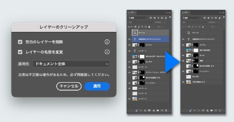 制作管理では「レイヤーのクリーンナップ」機能を追加。レイヤー名の自動整理や不要レイヤーの削除により、複雑になりがちなレイヤー構造を整理しやすくした。