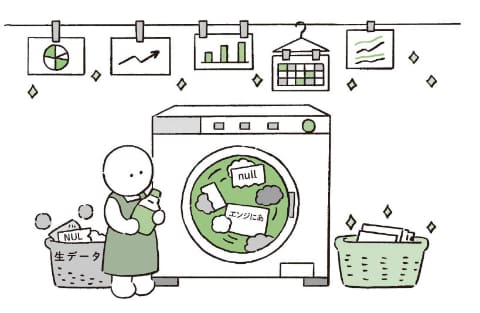 イラストの中には、「null(何もない)=欠損」「エンジにあ=誤り」といったそのままでは使えない「汚れた」データたちが洗濯機の中で洗われ、きれいになったデータがグラフとして干されたあと、最後にかごに整頓されて収められています。