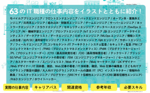 「BIエンジニア」「データアナリスト」「データエンジニア」など、似た職種の違いをどう表現するか、またシステム開発のように目に見えない概念をどのようにイラストで可視化するかを考えるのは苦労しましたが、いずれの職種も「1枚絵でどんな仕事かわかる」ようになっています。63ものIT職種をイラストで一覧できる本はほかにないでしょう。