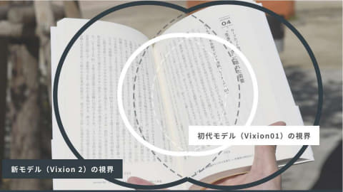 「ViXion2」では、レンズが大型化したことで視野が大きく広がりました。実際に視野について記者会見で公開されたイメージ画像があるのですが、旧モデルでは文庫本の一部しか見えず、ViXion2では文庫本のページ全体が見えるという説明で、実際に使った感覚とかなり近い画像です。文庫本の場合、ページ全体がほぼ視野に入りますので、旧モデルと違って頭を動かさなくても目だけで文字を追えます。これは使い勝手として大きく前進していると感じました。前モデルからオートフォーカスの素早さも継承していて、キビキビとピントが合います。