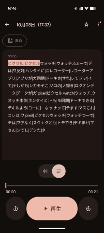 録音品質は十分。口元にPixel Watch 4を近づけて数十秒録音する程度の用途であればまったく不満はありません。腕をダラッと下げた状態でも、自分自身の声は漏れなく録音できるはずです。ただし、Pixelが得意とするはずの文字起こしはもうメチャクチャの一言で、到底アテにはできません。この部分は要・改善ですね。