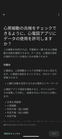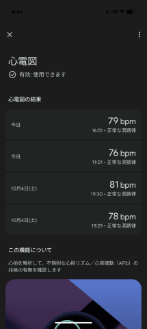 説明によれば、不整脈の一種である心房細動に関連して、その兆候を心拍リズム計測から発見するというのが、心電図機能の意義とのこと。Pixel Watch装着時はほぼ常時取得しつづける脈拍のようなデータとは異なり、ある特定の30秒間だけを計測するという仕様です。毎日一回測定するようなデータではないと思われますが、例えば月に1回・半年に1回というサイクルでの計測が身近な機器で行なえることには、少なからず意義があるでしょう。