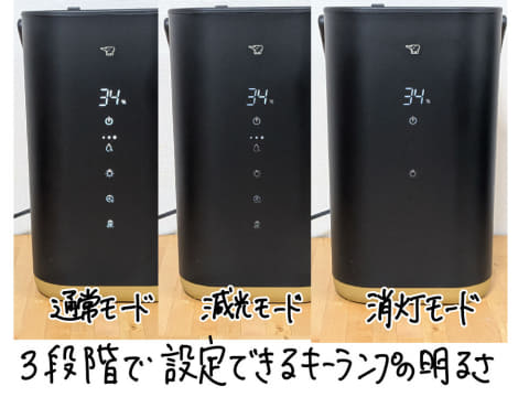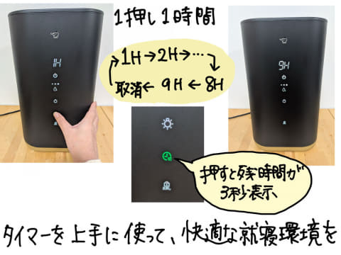 また加湿しすぎると、逆に肌が乾燥したりするようなので、寝る前にしっかり加湿して、タイマー機能を使って就寝中は加湿器を切るのが正解らしい。1時間単位で、1~9時間設定ができるので、これからはタイマーは適切に使っていこうと思った。