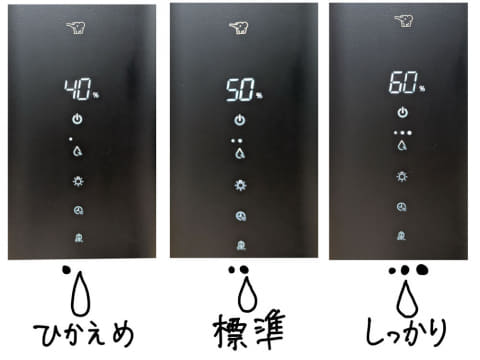 加湿器はとにかくとても静かだし、寝ている間は喉も肌もカラッカラになりがちなので、まずは寝室が最適かなと思い設置した。運転モードには「控えめ」「標準」「しっかり」と3モードあり、設定湿度はそれぞれ「40%」「50%」「60%」である。