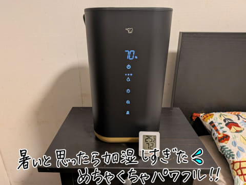 6畳の狭い寝室だけど、ひとまずお手並み拝見「しっかり」モードで加湿すると、1時間半もせず(うち45分程はお湯を沸かす時間で蒸気が出ないので、実質加湿45分程)、湿度は70%にまでになり、加湿時の熱も相まりサウナのような状態に(笑)。これは想像以上にパワフルだ。