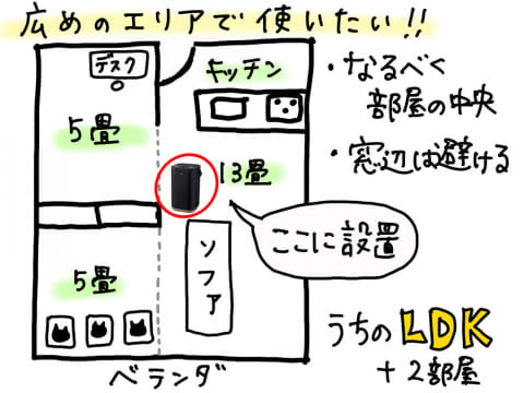 我が家はリビングが13畳なので丁度良い大きさなのだけど、引き戸を隔てた5畳の2部屋を開けっぱなしで生活しているので、20畳を超える空間になり、1台ではカバーしきれない。