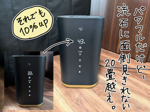 ちょっと広すぎて無理かなぁと思いながら使ってみた。すると2台配置するのが理想だけど、生活スタイル次第では1台でも十分使える。という結果になった。1台だけでしっかりモード(湿度60%)で運転すると、30%だった部屋の湿度を43%まで上げてくれたが、それで精一杯だった。設定の60%には至らない。