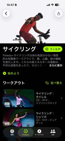 そこで、Apple Fitness+は「サイクリング」中心に行なうことに決めました。腕にApple Watchを装着し、iPhoneにインストールされている「フィットネス」アプリを開きます。「Fitness+」タブをタップすると、Apple Fitness+が始まります。アクティビティタイプの中から、「サイクリング」を選択。