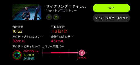 「マインドフルクールダウン」は、ストレッチなどの穏やかな運動が用意されています。サイクリングの後なので、全身のストレッチになりそうなワークアウトを行ない、今日の運動を完了しました。