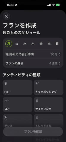 そこで役立つのが、カスタムプランを作れる「プラン」です。サイクリングをする日、筋トレをする日など曜日ごとに選択できます。決めた日はApple Watchにアイコンが出て、トレーニングを思い出させてくれます。
