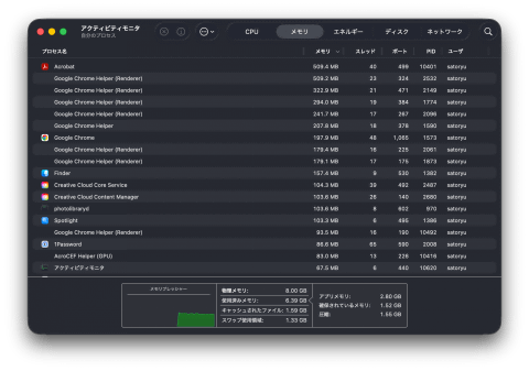 この状態でアクティビティモニタ(Windowsのタスクマネージャーのようなアプリ)を立ち上げてみるとメモリ使用量は6GB超と表示されました。ここにさらにいくつかのアプリを開く、ブラウザのタブを開くとあっという間に8GBを超えてしまいそうですが、筆者の普段使いであれば少ないと評されるメモリ容量 8GBでも問題はなさそうです。