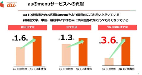 その意味で、menuにとってのメリットは明らかだ。auスマートパスプレミアムには、3月末時点で1,246万人の会員がいる。このユーザーの一部をmenuに送客できる効果は大きい。過去の特典でも、「au ID連携済みの方は初回注文率が1.6倍、注文単価が1.3倍、さらに大きいのは継続注文率が3倍以上に伸びている」(KDDI パーソナル事業本部 サービス統括本部 副統括本部長 大野高宏氏)といい、影響のほどがうかがえる。