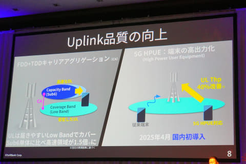 こうした背景もあり、ソフトバンクでは「広帯域の周波数とアップリンクの品質をもっともっとも高めていく」(佃氏)方針だ。その1つとして、ソフトバンクが活用するのは、FDD方式とTDD方式のキャリアアグリゲーションだという。