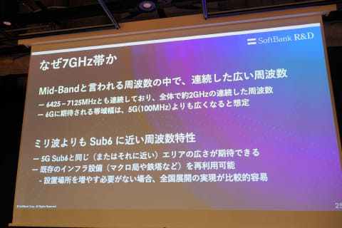 こうした中、ソフトバンクは6Gで利用する周波数帯として、センチメートル波とも呼ばれる7GHzを取り上げ、その携帯電話への割り当てを要望している。6Gでは、ミリ波よりもさらに高いサブテラヘルツ波やテラヘルツ波を活用する方針もあり、ソフトバンク自身も無線の実証実験を進めているが、やはりその周波数上、非常に直進性が高く、基地局として実装するハードルが上がる。