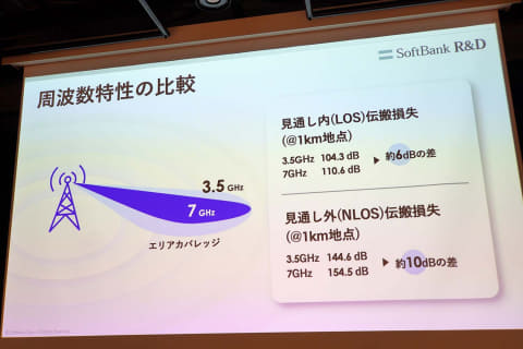 ただ、低い周波数帯と言っても、それはあくまでサブテラヘルツ波などと比べた時の話。ケタは同じでも、現行のSub 6で使われている3.7GHz帯や4.5GHz帯より数値は高い。そのため、「7GHz帯と3.5GHz帯の見通しでの伝搬損失を計算すると、大体6dBの差が出てくる」(矢吹氏)という。やはり、周波数が高いぶん、遠くまで届きにくくなる特性がある。