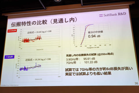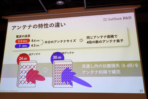 一方で、3.5GHzとの比較だと7GHz帯はちょうど周波数が2倍になるため、「アンテナサイズは半分にできる。面積を同じにすれば、アンテナ素子が縦横それぞれ2倍になるので、4倍を収容できる」メリットがある。Massive MIMOのアンテナ素子を増やし、「アンテナ利得を上げることで、見通しの伝搬での損失を補完できる」というのがソフトバンクの見立てだ。