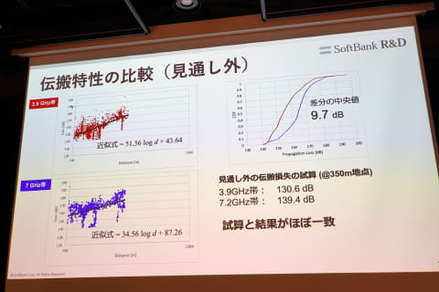 ソフトバンクは仮説として、「銀座のような環境だとビルに電波が反射しながら、なかなか外にエネルギーが漏れていかないため、思っていたよりも減衰が少なかった」としている。一方で、見通し外だと電波の減衰が大きく、「大体シミュレーション結果と一致している」という。