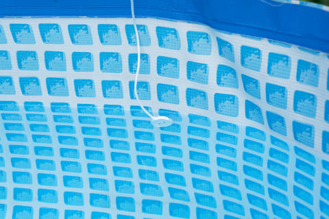 というわけで、筆者宅の庭に設置したプールに水漏れセンサーをセットしてみました。コード付きタイプだと、本体をプールの縁などに置き、コード先のセンサーを水を検知したい位置にぶら下げておくことができます。