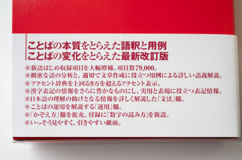 「新明解国語辞典」は、その名が示すように独自の分かりやすい説明がウリで、用例も充実していて、確かな満足感があります。見出し語はゴシック体、それ以外は明朝体です。三省堂の国語辞典の特徴を反映し、新語の収録にも積極的。アクセント表示という、ほかの2冊にはない特色もあります。収録語数は約79,000語で、3冊の中では最多です。