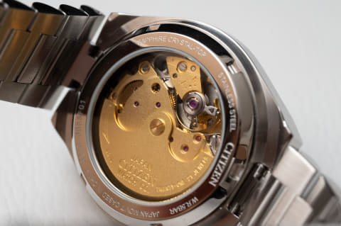 機械式ムーブメント「Cal.8210」は40mmモデルと同じで、信頼性の高い、歴史のある設計を継承したムーブメントです。シチズングループのムーブメントブランド「ミヨタ」で、組み立ては日本です。ゼンマイを巻き上げるローター(回転錘)にはシチズンの刻印が施されています。この価格帯ではプリントで済ませる場合も多いので、安っぽく見えないのはありがたいところ。
