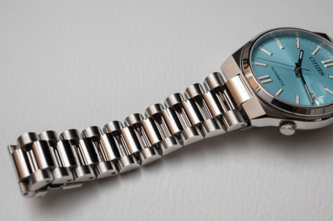 こうした時代の進化が最も分かりやすいのはメタルブレスレットでしょうか。シチズンのこれは、厚みがあって、実に堂々したものになっています。ポリッシュ仕上げとサテン仕上げの磨き分けもメリハリが効いています。コマはかまぼこ型のデザインで、雰囲気としては、少しラグジュアリー路線かもしれません。