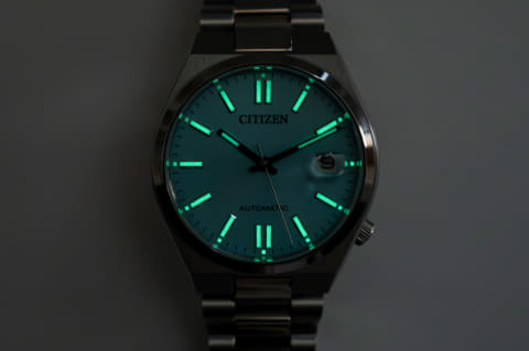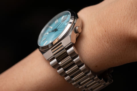 ダイヤルのカラー以外の部分は腕時計のスタンダードを突き詰めた内容です。ダイヤルのデザインは腕時計として王道的なものですし、バーインデックスは天面が白く爽やかな印象で、そこが夜光塗料になっていて実用性も確保されています。このインデックスや針のポリッシュ仕上げも綺麗で、視認性が高く、各部をいろいろ見ても隙がありません。