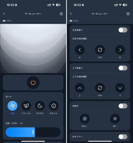 操作は本体のタッチパネル、付属のリモコン、そしてSwitchBotアプリの3つに対応しています。アプリでは風量をかなり細かく調整できるほか、首振りも上下・左右それぞれのオン/オフや角度指定まで設定可能です。一方で、本体やリモコンからは風量を9段階で切り替えられ、首振りはオン/オフの操作ができます。細かい制御をしたいときはアプリ、ちょっとした操作は本体やリモコンと、用途に合わせて使い分けられるのが便利です。