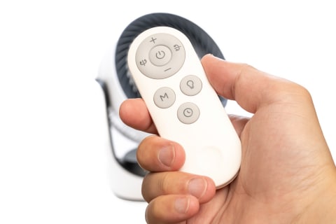 このモデルはUSB-Cケーブルまたは付属の電源ケーブルで充電が可能。風量はアプリ上では、1〜100%まで調整できますが、本体やリモコンでは9段階とざっくりした設定となります。公称では最小のレベル1で約49時間、中間のレベル5で約13時間の連続運転が可能です。首ふりや常夜灯を併用すると駆動時間は短くなりますが、日中に使って夜に充電するサイクルで十分実用的でした。