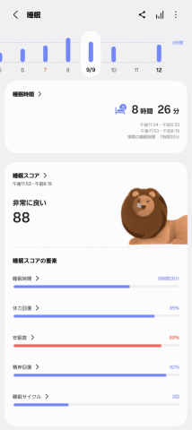 健康管理機能についても進化が見られます。Fit2にも心拍数やストレス測定機能はありましたが、Fit3では血中酸素レベルの測定に対応し、睡眠トラッキング機能もより細かいデータやアドバイスを表示するようになりました。Galaxyスマートフォンと連携すれば、睡眠中のいびきの記録も可能です。