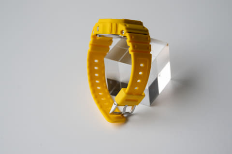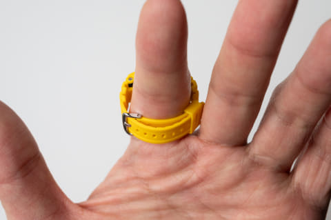 このバンドの付け根の部分、G-SHOCKと同じ波型のデザインも再現されており、これもいい塩梅に作用していそうです。形が変わらない金属製の指輪だと指の動きやむくみでフィット感が変わりますが、G-SHOCKのバンドをそっくりそのままダウンサイジングしたG-SHOCK nanoのバンドは、指が多少ふくらんでもバンドが伸びて追従できる余白が残されています。グー、パー、といった指の動きでも、締め付けられるような感覚にはなりません。これは意外にも快適だなと思えた部分です。