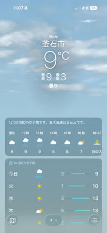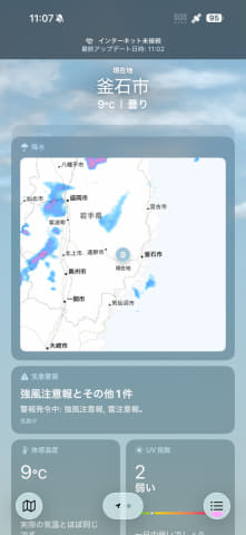 まず使ったのはApple純正の天気アプリです。これはau Starlink Directとの通信でも、通信量を制限せず、通常のアプリと同じように通信ができる仕様ですが、今後の天気や地図上での雨雲の状況など、問題無く確認できました。これなら雨宿り中でも天気の確認ができる、と思いたいところですが、実際の荒天時にどのくらいStarlinkの電波を受信できるかは未知数ですので、過信はできないですね。まったく見られないよりはマシでしょう。