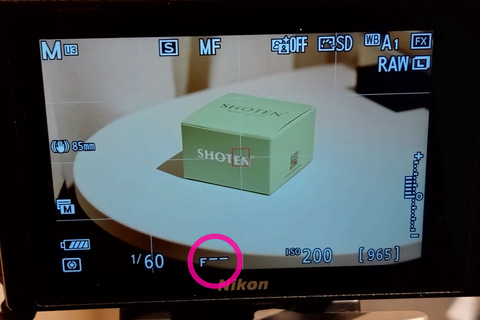 SHOTENが採用するこの仕組みに課題が無いわけではありません。ひとつはファインダー/モニターのライブビュー画面の露出の問題、もうひとつはF13以上を使用することへの制限ですが、どちらも対処法を見つけました。