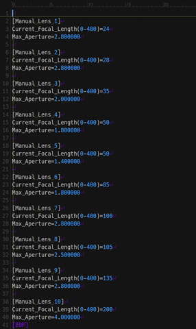この問題は、マウントアダプターに格納されているレンズスペック情報(10種類)を書き換えられる機能を応用して、10種類をすべて同じ内容に揃えてしまうという方法で、一応の回避ができました。