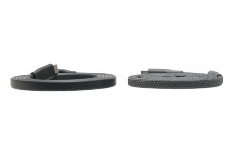 違いは素材と復元力です。フラットスパイラルケーブルはブレイデッドナイロン素材で、手を離すと引き合って巻取り式ケーブルのように自動で戻ります。復元力が強めで手を離せば勝手にまとまります。一方のフレックススパイラルケーブルはTPE素材で、軽く巻いてマグネットを合わせると薄い円盤状にまとまります。こちらは1mをフルに伸ばしても縮もうとする力は弱いです。