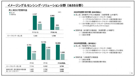 ソニーの十時裕樹副社長兼CFOは、8月4日に開催された2020年度第1四半期の連結業績説明会で、今後の見通しとして、「コロナ後の、ハイエンドスマートフォンの売れ行き鈍化が目立つ」と語った。そのため、同社のイメージセンサー関連事業は、営業利益が1四半期に49%(241億円)もの大幅減益となり、2020年通期の予想も、約45%(1,056億円)の減益となる、1,300億円にとどまる見通しだ。