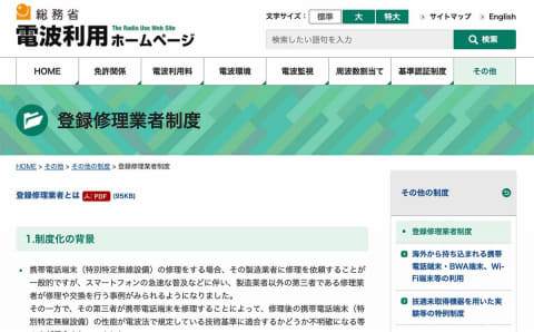 ルールの是非はともかく、日本ではそういう運用になっているので、2015年から「登録修理業者」制度がスタートした。携帯電話の修理を適法に行なう事業者は総務省に「登録修理業者」として登録し、電波法上の問題が起きない形で業務を行なうことが求められている。