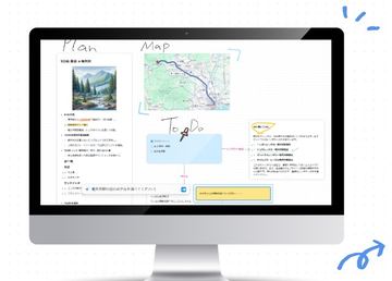 これは、Macでフリーボードを表示した画面だ。かなりごちゃごちゃ書き込んでみたが、どうだろうか。文字も画像も線画も付箋も、自由に文書内に置かれているのがお分かりいただけるだろうか?
