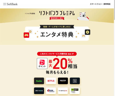 ソフトバンクは「メリハリ無制限」の契約者を対象に、YouTube Premiumの利用料金を割り引くプランを提供しているのに加え、ABEMAなどの動画・音楽配信サービスの月額料金の最大20%相当を毎月PayPayボーナスで付与する「エンタメ特典」も提供している。これは「爆アゲ セレクション」に近い。