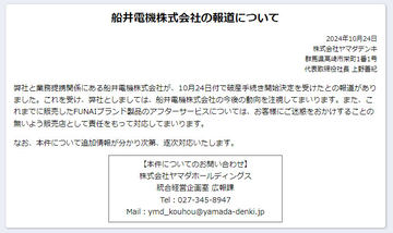 ヤマダデンキは「FUNAIブランド製品のアフターサービスは責任をもって対応する」とコメントしている。