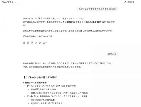 まずは「カブトムシを育てる方法を教えてください」という質問を投げかけてみよう。
