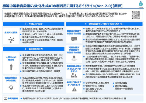 「初等中等教育段階における生成AIの利活用に関するガイドライン」は2024年12月、Ver.2に改定されて現在も運用されており、各種情報は以下のサイトで公開されている。