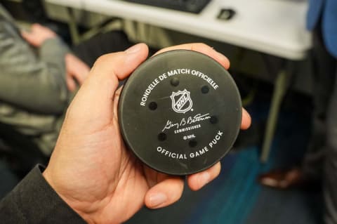 ホッケーパックは最大時速320kmという、猛烈な速度でシュートされる。これを間違いなく判定するには、ビデオ判定の仕組みと同時に、ホッケーパック内のセンサーが使われる。以下の写真にも、パック内に組み込まれたセンサーの一部が写っているのがわかる。