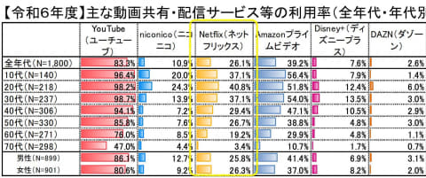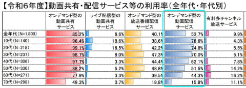ただ、YouTube等を含む「オンデマンド型の動画共有サービス」を見ると、利用率は圧倒的に高くなる。要はYouTubeの利用比率が高いのだ。