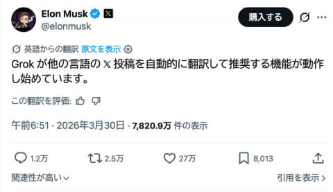 以前よりGrokを使った翻訳はできたのだが、イーロン・マスクは「Grokが他の言語のX投稿を自動翻訳して推奨する機能が動作し始めています」とポストし、この機能が「自動的に働くようになった」ことを明かした。