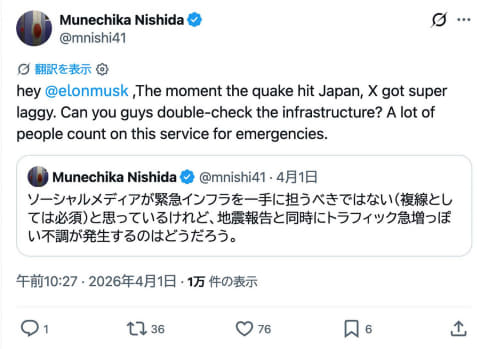 hey@elonmusk,The moment the quake hit Japan, X got super laggy. Can you guys double-check the infrastructure? A lot of people count on this service for emergencies.https://t.co/2017dg7OWu