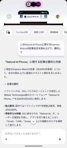 また、気になる情報をウェブなどで見ている時には、「AI」ボタンを押すことでその内容をAIに送って覚えておいてもらい、概要解説やAI連携に活用できるようにもなっている。
