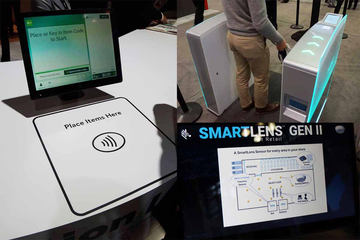 そして今年、RFIDの販売スタイルで注目なのが「スマートフィッティングルーム」と「Just Walk Out」の2つだ。前者はZebraブースでCrave Retailが展示していたもので、フィッティングルーム内のハンガーラックに商品を掛けることで、フィッティングルームに設置されたRFIDスキャナと商品のタグが反応して、商品情報を確認できるというもの。この手の仕組みはフィッティングルームのスマートミラー上に情報を映し出すサービスなどで以前から提供されていたりするが、Craveのシステムでは商品データベースと連動し、現在のサイズごとの在庫情報や他のバリエーションなどが顧客自ら確認できる。